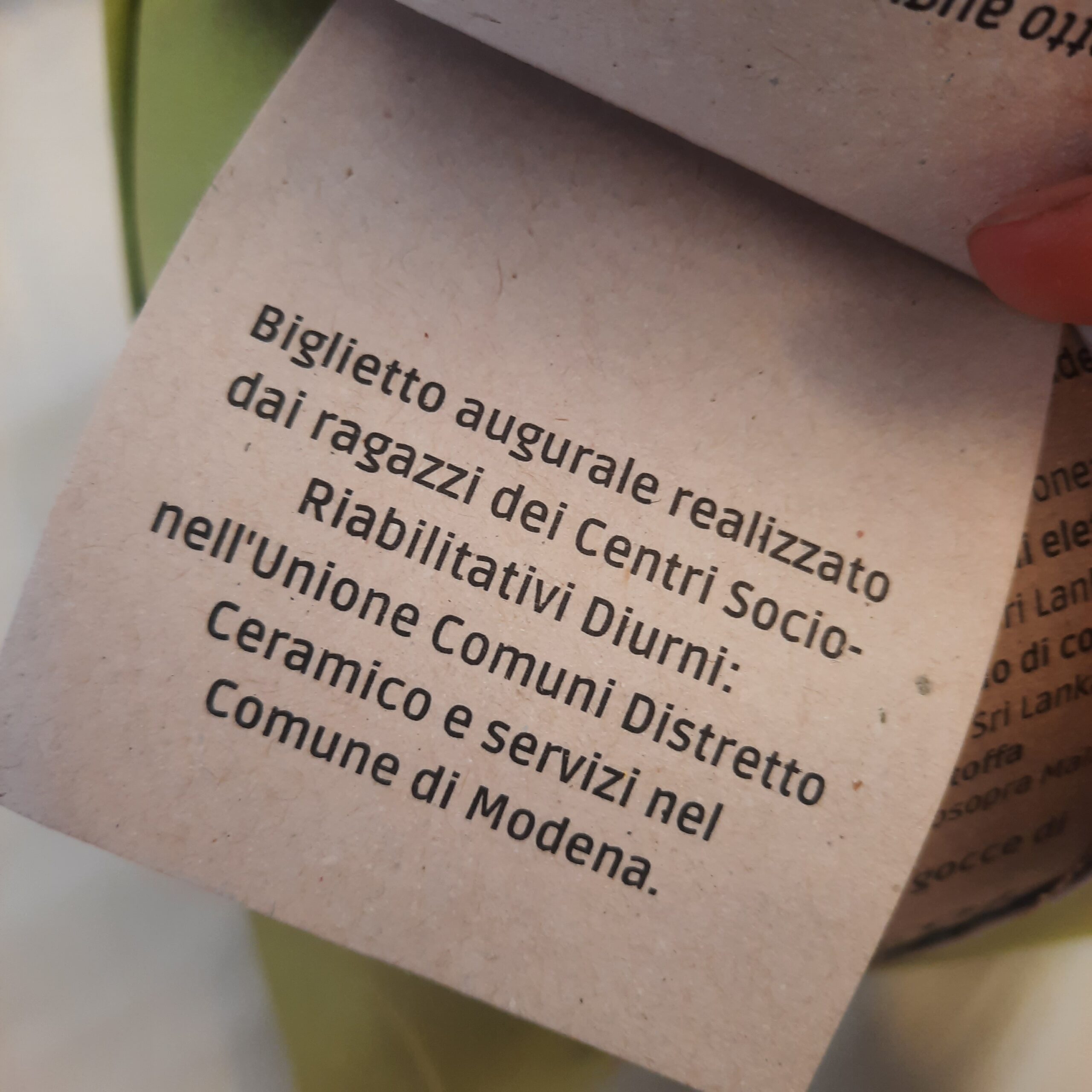 – contiene un biglietto augurale realizzato dai ragazzi dei Centri Socio- Riabilitativi Diurni: nell’Unione Comuni Distretto Ceramico e servizi nel Comune di Modena;