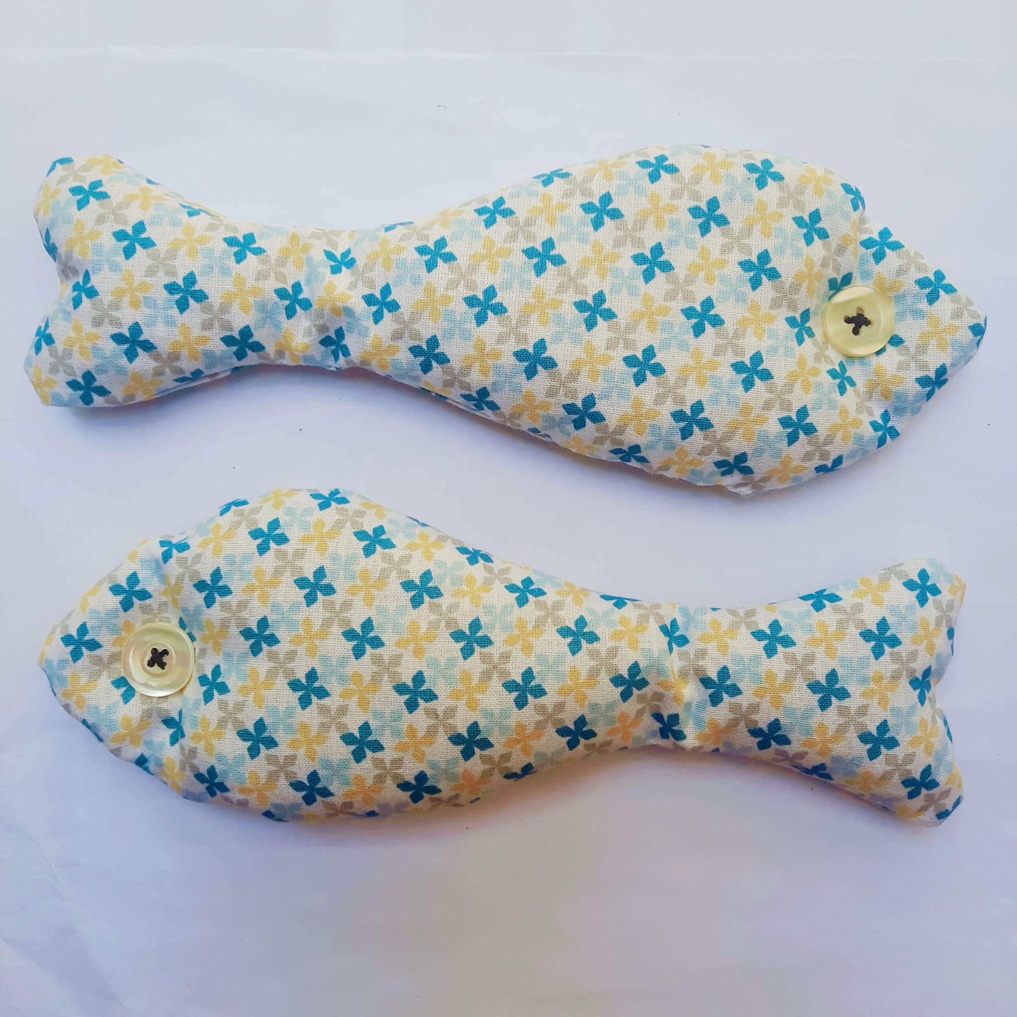 Coppia di pesci di stoffa ripieni di lavanda essiccata, decorati con bottoni. Da usare come assorbiodori per i cassetti, gli armadi, o da mettere in coppia… dentro le scarpe da ginnastica dei figli o dei mariti!
