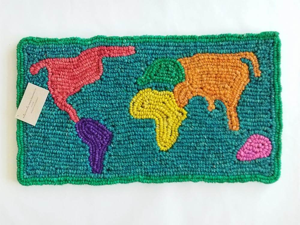 Zerbino in corda realizzata con fibra di cocco dallo Sri Lanka, con la rappresentazione del mondo.